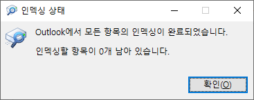 - 인덱싱 상태를 보면 수만 건 메일 항목이 인덱싱을 기다리고 있다고 나타났습니다. 어림짐작이지만 10초당 100건씩 줄어드는 것 같았어요.